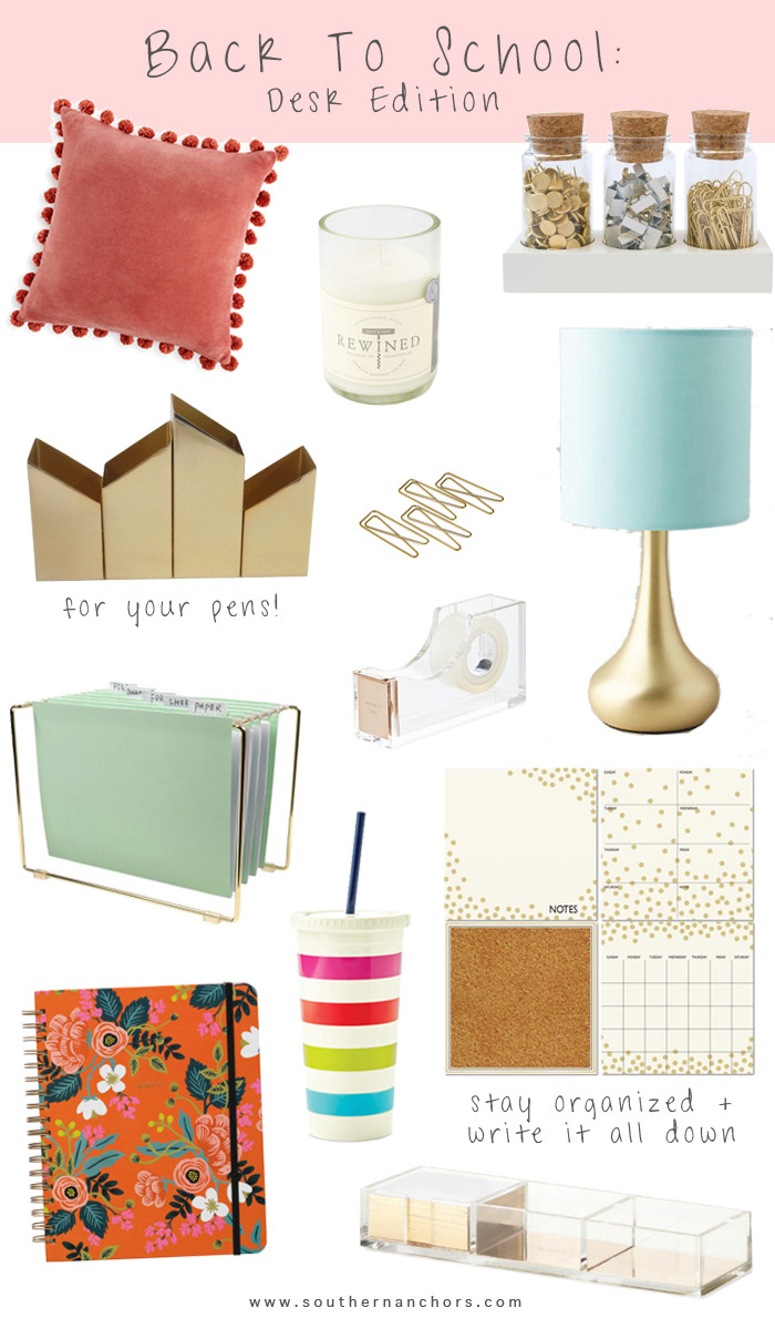 It's that glorious time of year! Back to school time! While I personally may not be going back to college (I wish I could go back every day) I love to use this time to shop for new desk supplies! I try to take this time to organize all of my receipts, bills, tax forms, etc. It's a good time of year to have that "half way check" with all of your paperwork. Sprucing up your desk space can be the encouragement you need to study more or get that paper written a bit faster. For all you college kids it's the best way to personalize your study space. Having cute pens and a fresh, new planner is the best way to keep track of exams, due dates, meetings, and your friends' birthdays! Don't forget to add a fun pillow to your chair and a bright lamp.