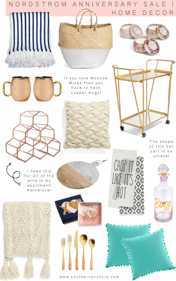 Striped Fringe Blanket // Two-Tone Straw Basket // Two-Wick Candle Set // Copper Mugs // Gold Mirrored Bar Cart // Wine Bottle Holder // Basket Weave Pillow // Marble & Wood Serving Board // Dish Towels // "Booze" Decanter // Cable Knit Blanket // XO Dish // Gold 5-Piece Place Setting // Turquoise PomPom Pillows